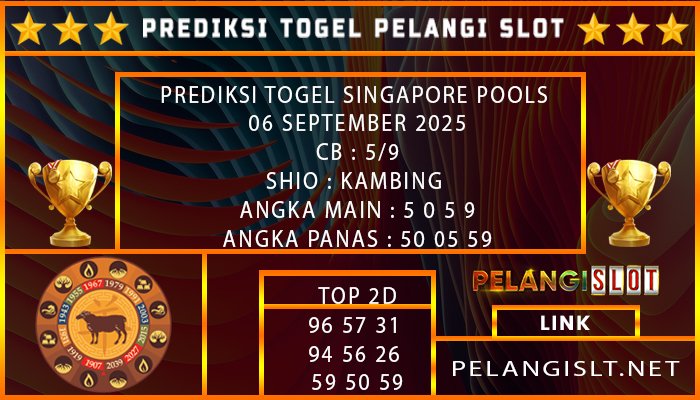 LINK PELANGISLOT PREDIKSI TOGEL SINGAPORE POOLS 06 SEPTEMBER 2025 Prediksi Togel Pelangislot akurat & terupdate. Temukan angka main paling jitu hari ini dengan bocoran togel terpercaya untuk jackpot besar
